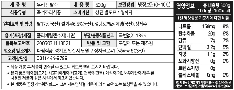 우리 단팥죽 (500g) 수량빼기 수량추가 4,800 원 총 수량 1 개 4,800 원 구매옵션 닫기 찜하기 추가 찜하기 삭제 구매후기 652 상품상세 정기구독 장바구니 정기구독 장바구니 구매하기 정기배송 장바구니