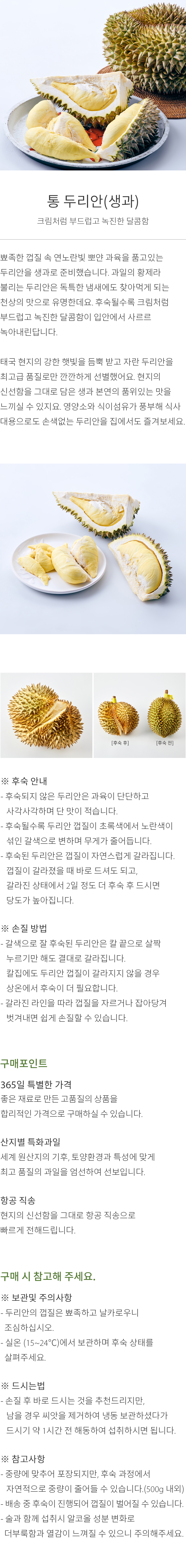 통 두리안 (생과 1통, 2.5~3kg) 수량빼기 수량추가 57,000 원 총 수량 1 개 57,000 원 구매옵션 닫기 선물하기 구매후기 23 상품상세 정기구독 장바구니 정기구독 장바구니 판매종료 정기배송 장바구니