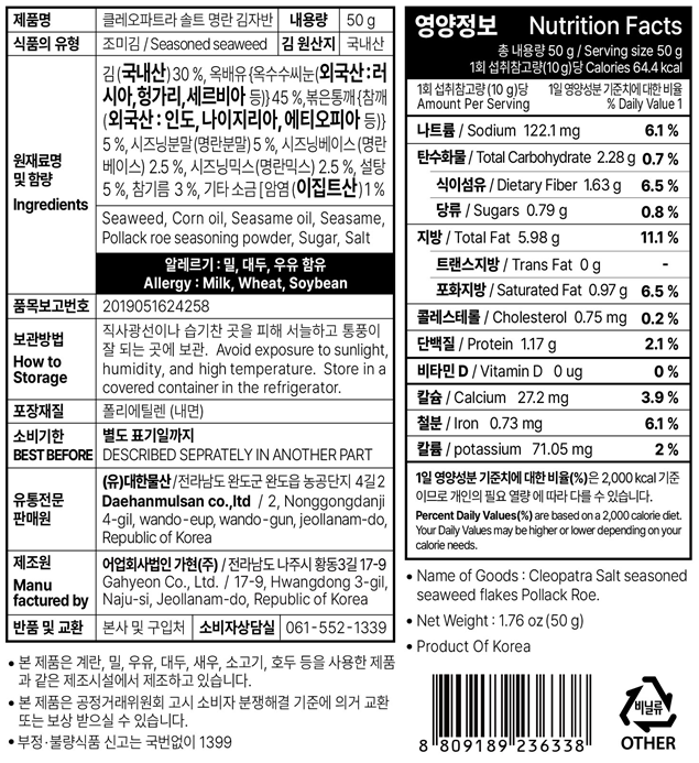 국내산 김과 제조사에서 직접 짠 기름, 그리고 이집트 고급 소금을 함유하여 제작한 특별한 김자반과, 김입니다.