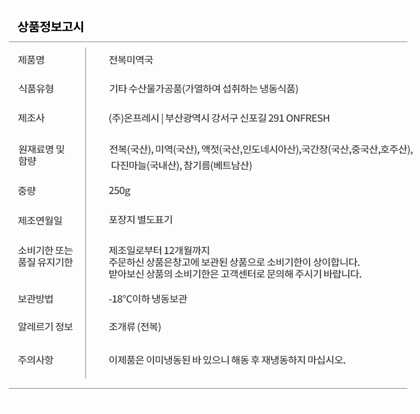 전복(국산), 미역(국산), 액젓(국산,인도네시아산), 국간장(국산,중국산,호주산), 다진마늘(국내산), 참기름(베트남산)