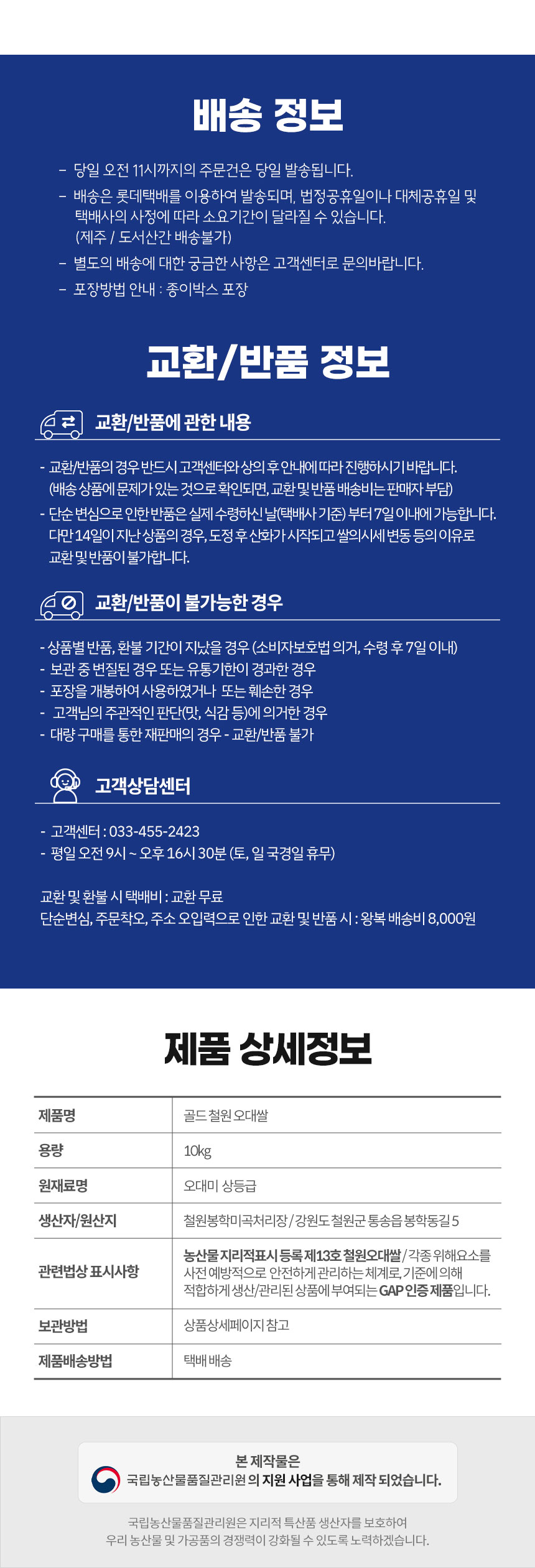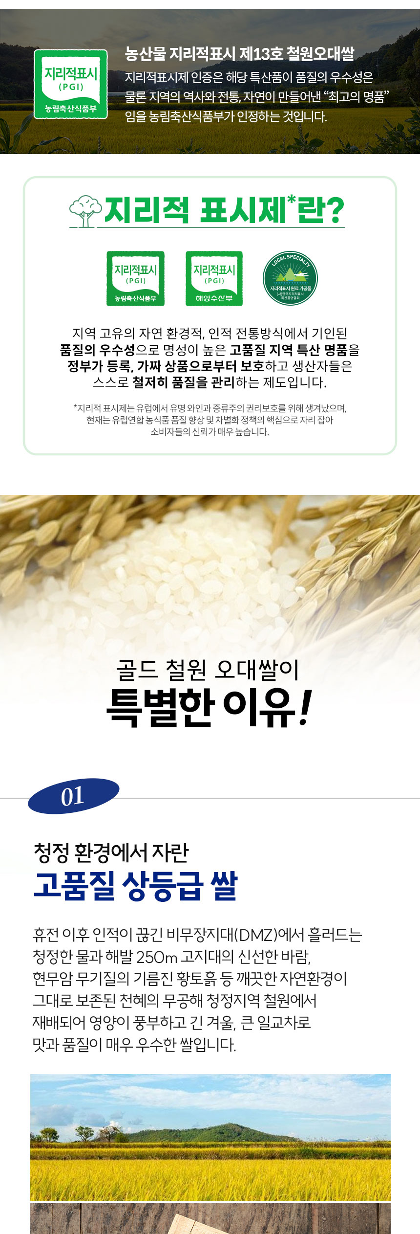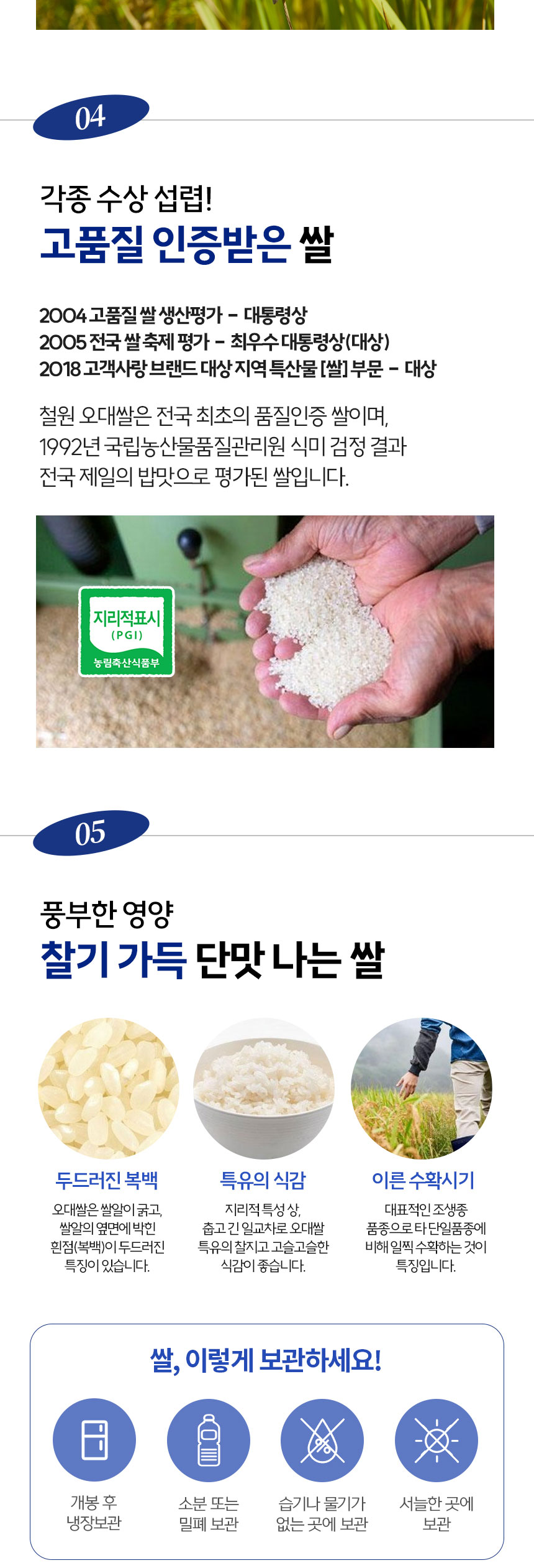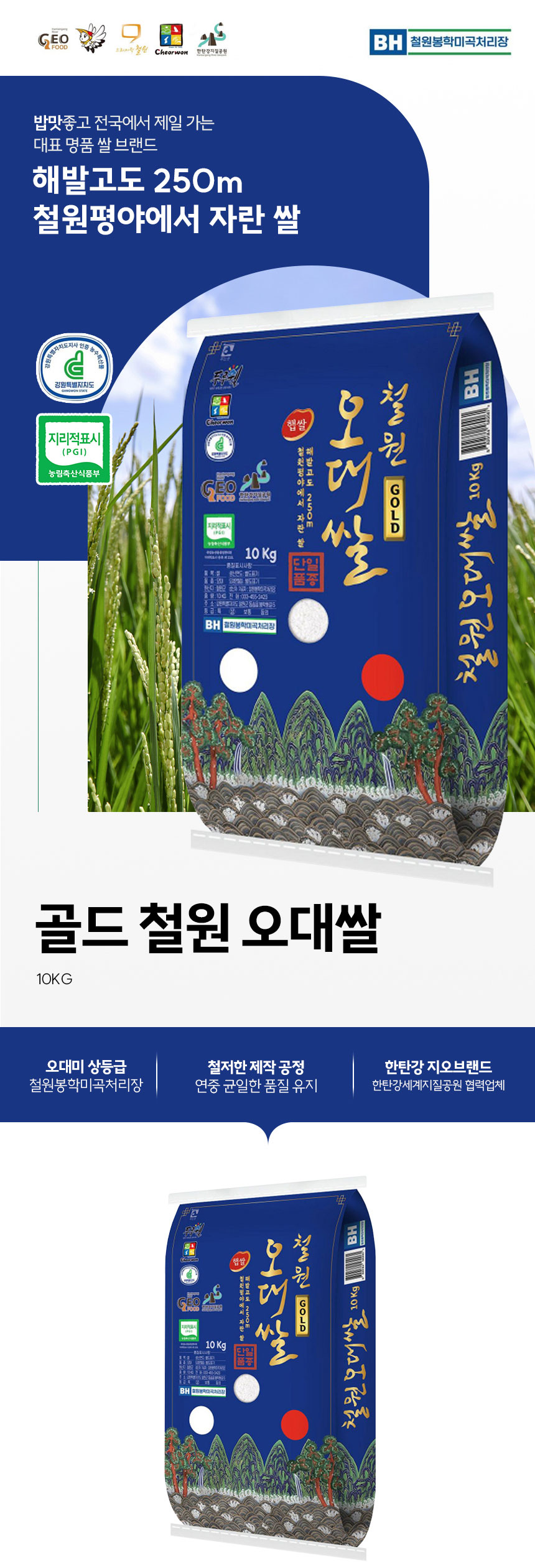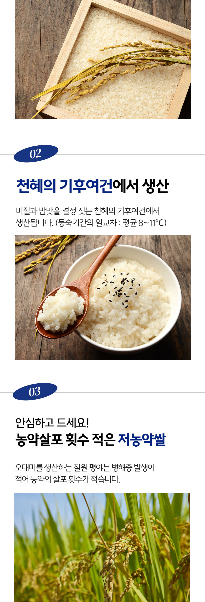 강원최대곡창지대이며 청정지역인 해발250m 고지대의 철원평야에서 자란 철원오대쌀의 비옥한토양, 깨끗한 물과 공기를 먹고 자란만큼 최고의 품질을 자랑합니다.