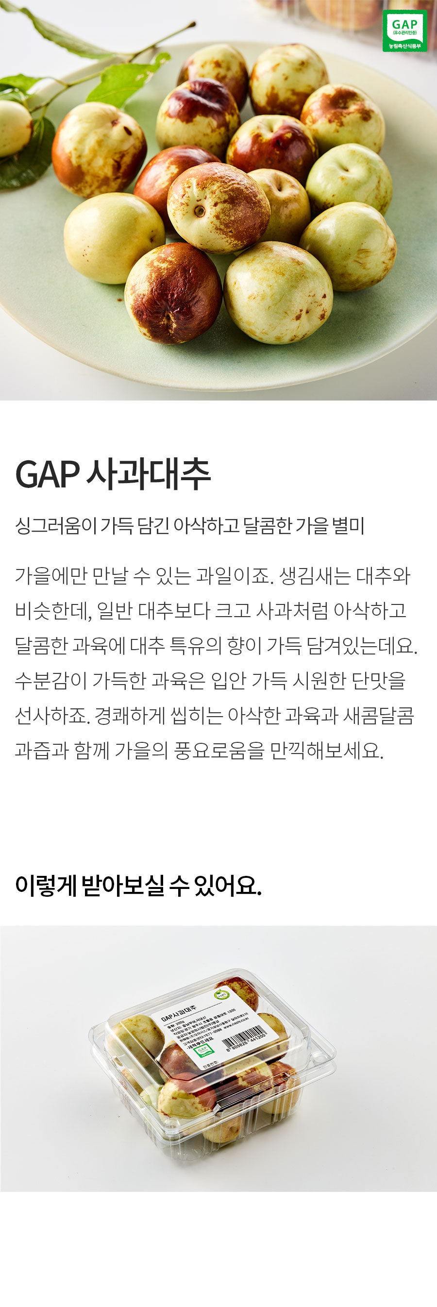 GAP 사과대추(240g) 수량빼기 수량추가 개 3,900 원 총 수량 1 개 3,900 원 구매옵션 닫기 선물하기 구매후기 367 상품상세 정기구독 장바구니 정기구독 장바구니 구매하기 정기배송 장바구니
