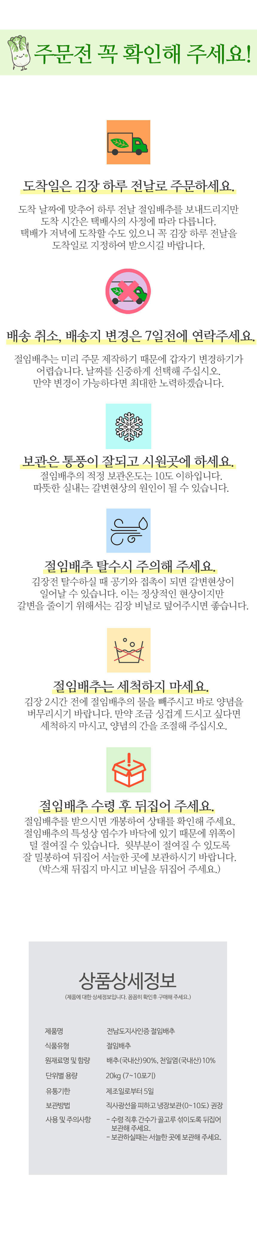 수령 후 상품상태 먼저 확인하시고 바로 사용하지 않으시려면 뒤집어서 보관, 받은 당일 김장 권장. 갈변 현상이 오기때문에 물은 1~2시간 정도만 빼는걸 권장