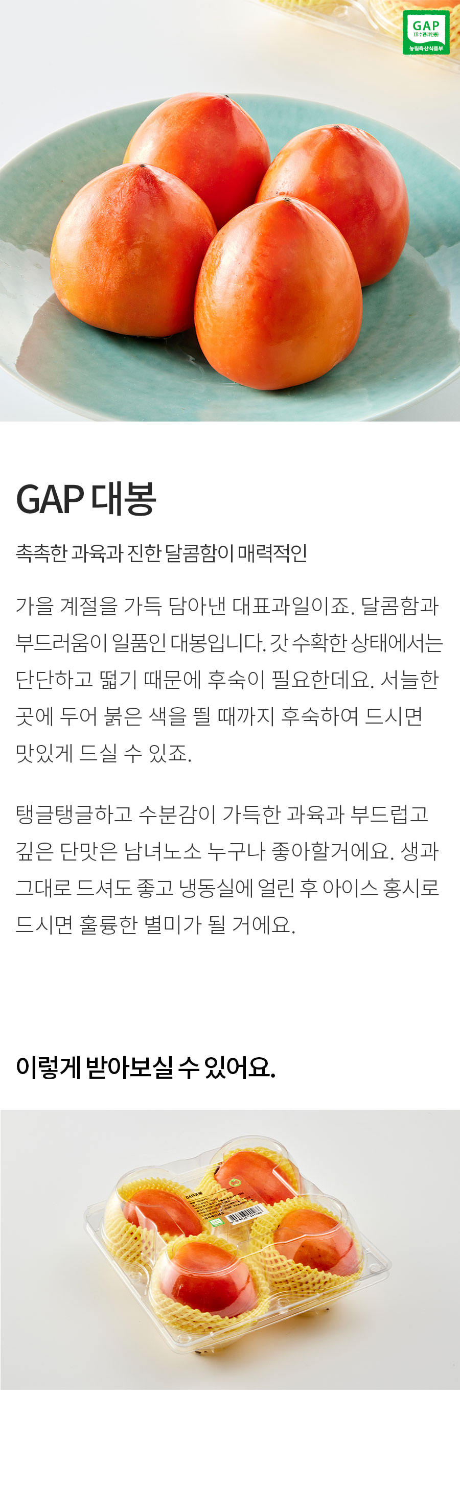 GAP 대봉(4입/900g) 수량빼기 수량추가 5,900 원 총 수량 1 개 5,900 원 구매옵션 닫기 선물하기 구매후기 270 상품상세 정기구독 장바구니 정기구독 장바구니 11월03일 입고예정 정기배송 장바구니
