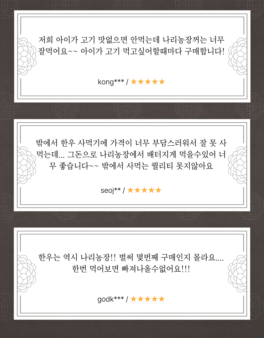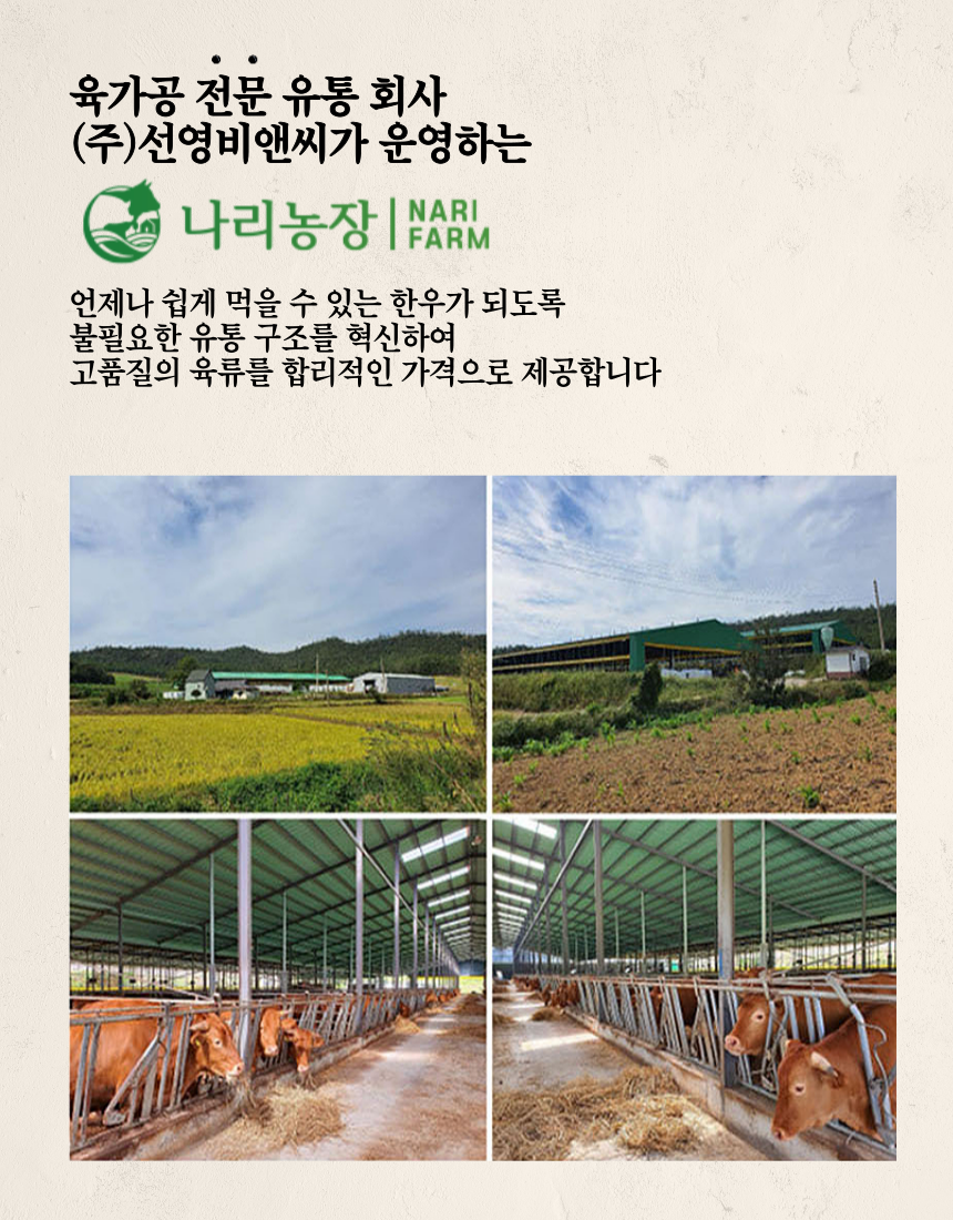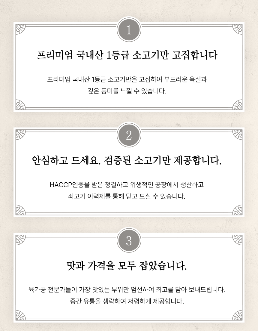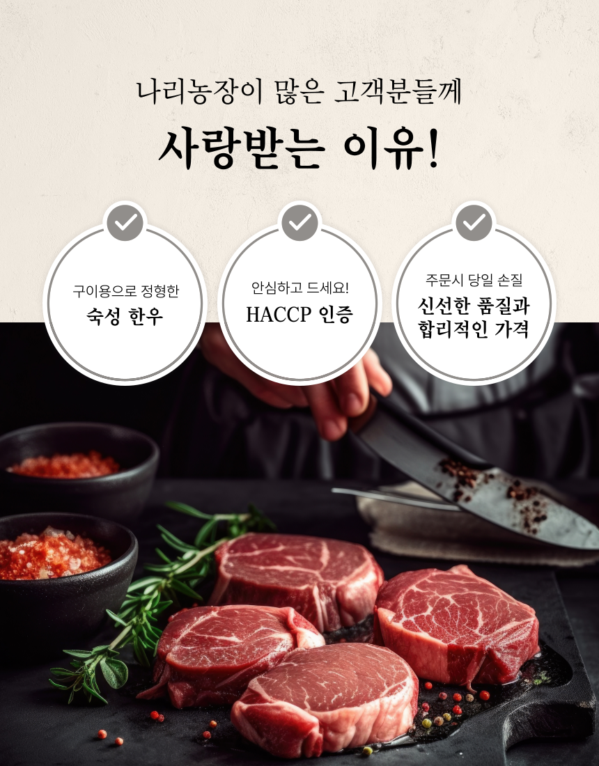 1. 믿을 수 있는 품질 : 공정하고 엄격한 기준을 갖춘 농협의 지육만을 제공받고 있습니다.