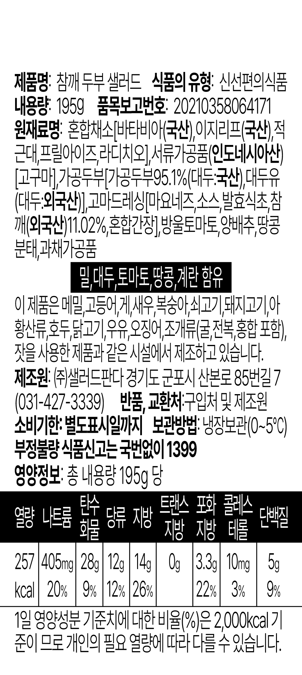 [세끼판다] 참깨두부 샐러드(195g) 수량빼기 수량추가 5,700 원 총 수량 1 개 5,700 원 구매옵션 닫기 찜하기 추가 찜하기 삭제 구매후기 679 상품상세 정기구독 장바구니 정기구독 장바구니 품절 정기배송 장바구니