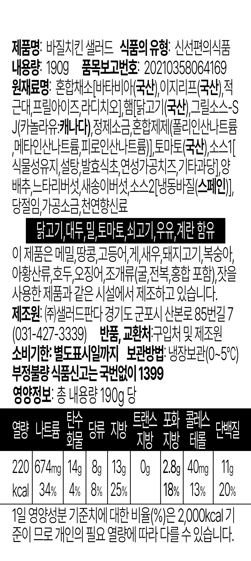 [세끼판다] 바질치킨 샐러드(190g) 수량빼기 수량추가 5,900 원 총 수량 1 개 5,900 원 구매옵션 닫기 찜하기 추가 찜하기 삭제 구매후기 1,061 상품상세 정기구독 장바구니 정기구독 장바구니 품절 정기배송 장바구니