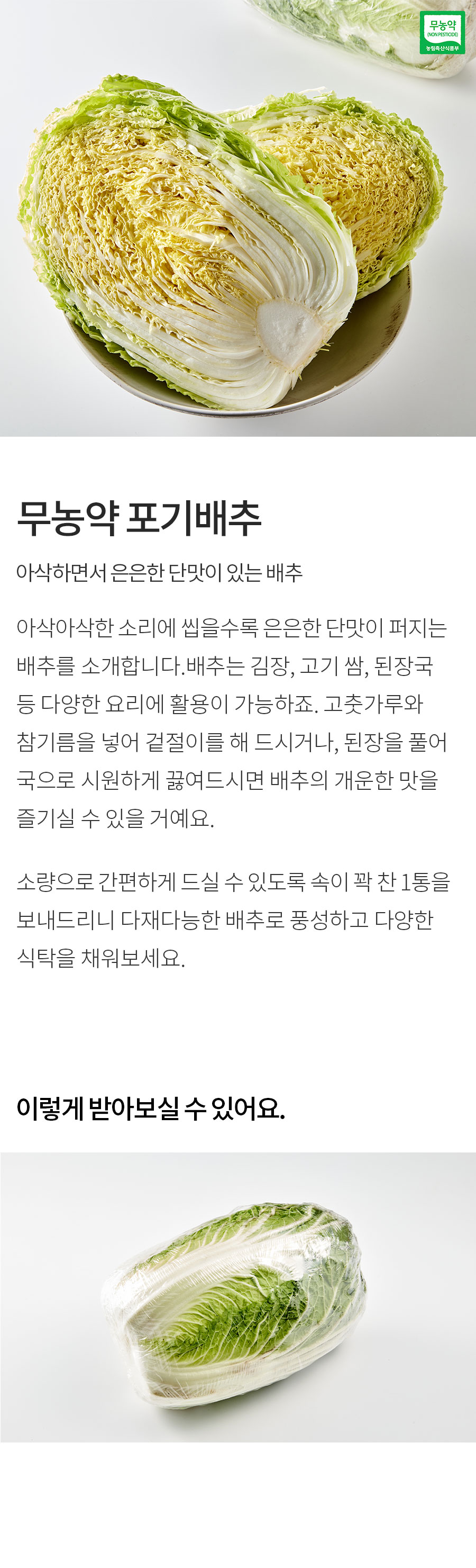 무농약 포기 배추 (1통, 2kg이상) 수량빼기 수량추가 7,360 원 총 수량 1 개 7,360 원 구매옵션 닫기 찜하기 추가 찜하기 삭제 구매후기 350 상품상세 정기구독 장바구니 정기구독 장바구니 구매하기 정기배송 장바구니